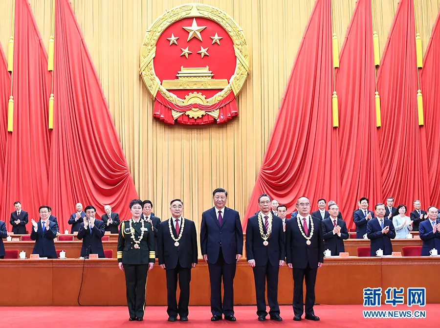 9月8日,全国抗击新冠肺炎疫情表彰大会在北京人民大会堂隆重举行。中共中央总书记、国家主席、中央军委主席习近平向“共和国勋章”获得者钟南山(前排右二),“人民英雄”国家荣誉称号获得者张伯礼(前排左二)、张定宇(前排右一)、陈薇(前排左一)颁授勋章奖章。新华社记者 谢环驰/摄